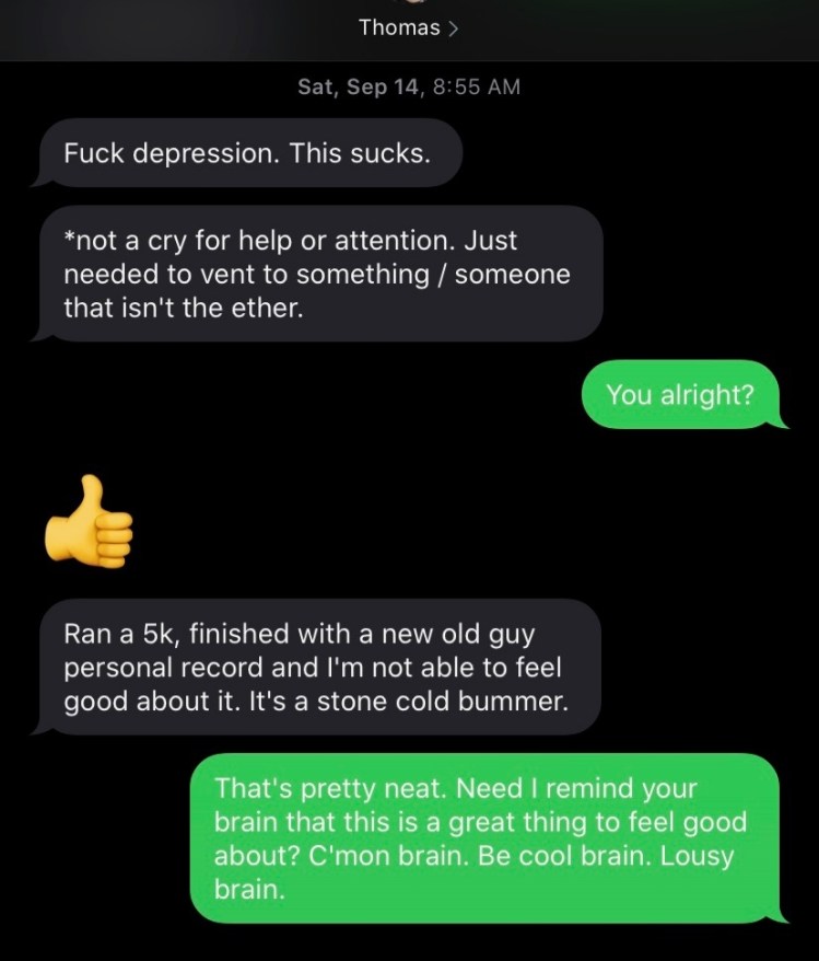 On September 14th, I, once again, realized that something was wrong. I had just finished my last 5k of “the season” and finished with a time of 22:13. This time was a whole four minutes faster than that of my first race of the year, but I felt no sense of accomplishment and nothing that resembled happiness. At the award ceremony, I had the following text conversation with a friend.